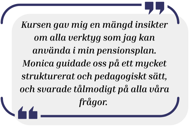 Oavsett ålder kommer du att ha nytta av kursen, men den är speciellt lämpad för dig som vill börja planera din pension och har några år kvar tills du ska dra ner på takten eller vill sluta jobba.
