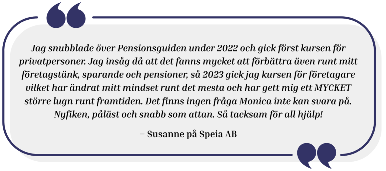 Med min stora passion för pension och företagande hoppas jag nu få träffa dig i min kurs för företagare där vi sätter ljuset på hur du kan skapa stora möjligheter för din framtida pension som företagare.
